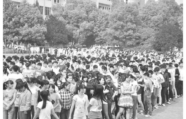 6月17日,随县二中举行防震疏散演练活动。下午4点,警报声响起,正在上课的高一、高二年级的1700多名师生迅速地从两栋教学楼上有序撤离,不到4分钟时间,全体师生都聚集到足球场中间。 (周可刚 摄)