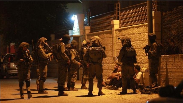 6月22日,以军士兵在约旦河西岸城市伯利恒附近一小镇拘捕巴勒斯坦人。为了寻找6月12日失踪的三名犹太青年,以军连续多天在约旦河西岸地区展开大规模搜捕行动。以色列指责巴勒斯坦伊斯兰抵抗运动(哈马斯)实施了绑架,但是哈马斯予以否认。新华社发(卢埃·萨巴巴摄)