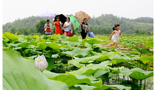 广水市蔡河镇引进集高产、观赏于一体的“冠优1号”优质莲藕在机场村首次浅水种植喜获成功。6月中旬以来,种植基地120亩莲藕荷碧花香,吸引大量城乡游客前来观光游览。(通讯员 陈永平 摄)