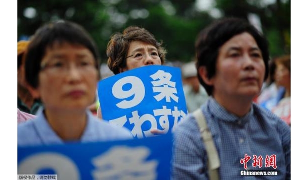 资料图:6月17日晚,约5000名日本民众聚集在东京日比谷公园,举行集会反对安倍内阁解禁集体自卫权。图为日本民众举着“反对战争”“不要破坏(宪法)第九条”等牌子坐在集会现场。