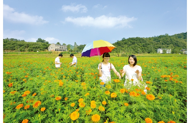 一朵朵五颜六色的鲜花争奇斗艳,让7月的曾都区洛阳镇银杏谷成了花的海洋。该镇农民企业家严贤涛在当地流转土地130余亩,栽种万寿菊、薰衣草等20余种观赏、药用花卉,吸引了众多游客。 (记者 李文军摄)