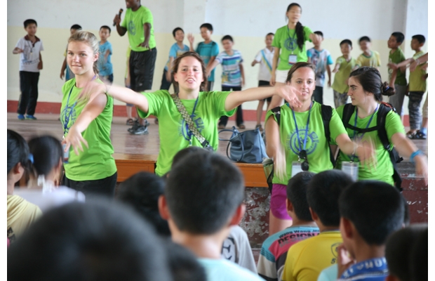 7月7日,来自美国的外籍教师艾丽丝(左二)和同伴们,正在与大洪山风景区中心学校的学生们进行英语口语互动。由风景名胜区上海耀华国际学校和大洪山中心学校联合组织的夏令营为期一周,来自耀华学校的40余名外籍教师和学生,将与大洪山300余名山区学生共同开展英语口语交流,提高山区学生的英语口语水平。 (记者 钟克波 通讯员 贺晓利 孛涛 摄)