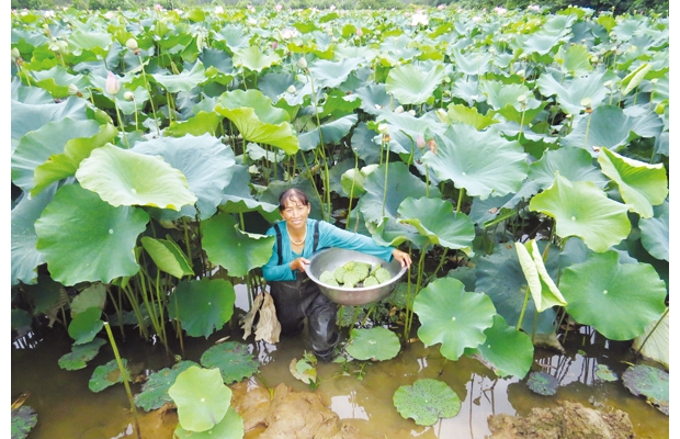 随县安居镇农民日前正在荷塘采摘莲子,村民们介绍,通过种荷、养鱼循环立体养殖,年收入还很可观。(记者 孙洪涛摄)