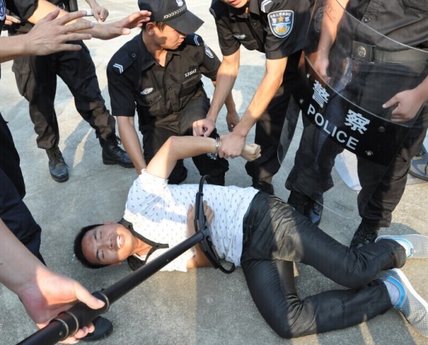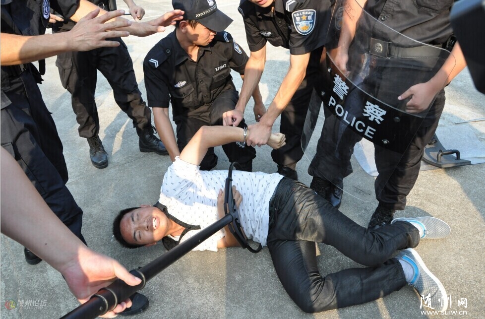 当日17时,一名“暴恐分子”悄悄走到正在厉山镇神农广场游玩的群众身边,突然抽出随身携带的长刀挥砍,场面十分危急。过往群众大惊失色,纷纷逃跑并大声呼救。接到报警后,指挥中心迅速指令巡逻、交警、派出所等多警种,共计30名民警组成的应急分队队员携带警械武器赶到现场。演练总指挥陈友元政委现场组织参战的巡逻大队警员负责围捕暴恐分子,其他应急队员负责疏散群众,疏导交通。接到“抓捕”口令后,三名手持盾牌的巡逻队员冲在最前面挡住“暴恐分子”,一名持锁腰钢叉的队员利用空档将其腰部锁住拖翻在地,随后,巡逻队员一哄而上,将“暴恐分子”死死摁倒在地,并将其制服,事件得到有效处置。