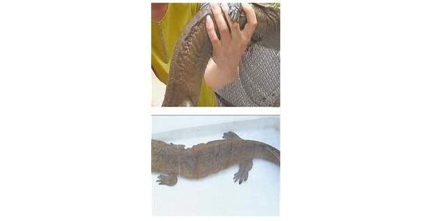 7月22日,在广水三潭景区一群众发现了一条长约72厘米、长相怪异的四脚鱼(如图)。经相关部门确认,这只怪鱼是国家二级保护水生野生动物“娃娃鱼”。在人们的帮助下,这只“娃娃鱼”被放归大自然。“娃娃鱼”学名大鲵,和恐龙同时繁盛于三亿五千万年前的古生代泥盘纪时期,被誉为“游动的活化石”, 是世界级濒危两栖动物,国家二级保护水生动物。趴在水盆中的这条“娃娃鱼”长约74厘米,重2.8公斤,在娃娃鱼中属于“大块头”。它体表光滑,布满粘液,灰白色的皮肤上布满了大小不等的云斑,头部扁平,短而扁的四肢上还有几个小趾头。风景区工作人员把这条“娃娃鱼”带到附近水质清澈的溪流放生,让它重回大自然怀抱。
