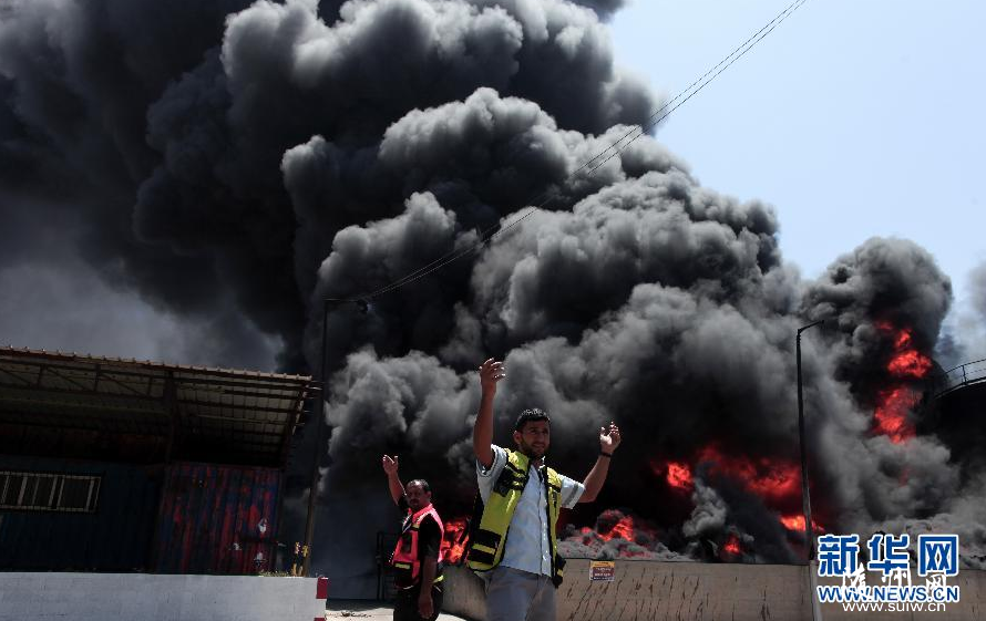 7月29日,在加沙城,巴勒斯坦消防员在起火的发电站储油仓库前工作。当日,以色列坦克击中加沙唯一发电站的储油仓库,导致加沙城及其他巴勒斯坦控制地区大面积断电,约180万人受到影响。 新华社发(纳萨尔摄)