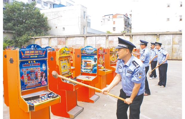 7月24日上午,曾都公安分局在局机关大院空地上,组织了一次集中公开销毁赌博机行动,共销毁赌博机300余台,表明了公安机关严厉打击利用电子游戏机赌博违法犯罪的信心和决心。 (通讯员 佘敏 杨英摄)