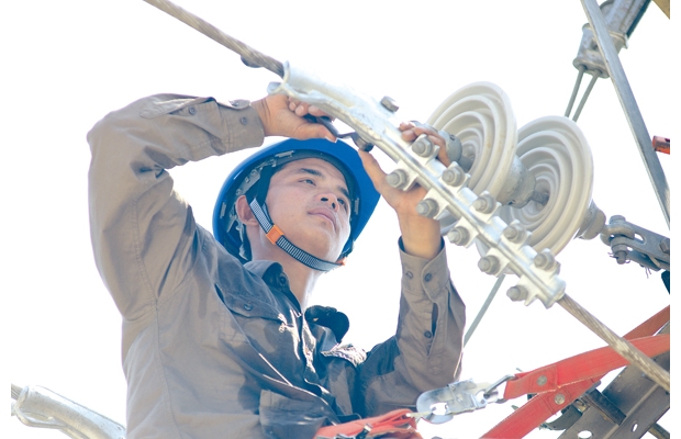 7月30日,电力工人顶着烈日和40℃高温在随县万和镇崇崇山峻岭之间架设一条新的10千伏线路。(记者李文军摄)