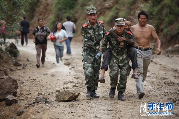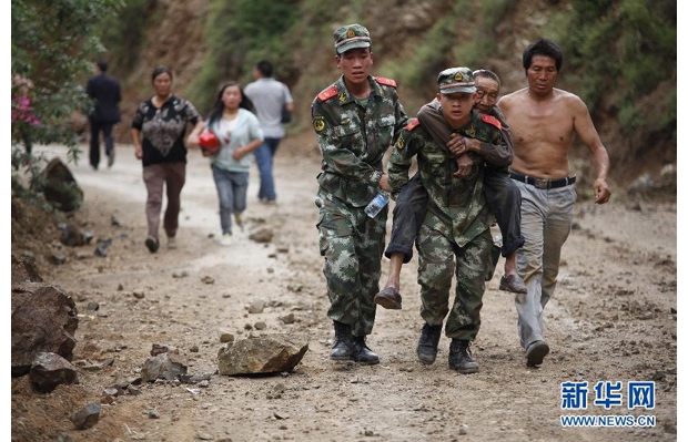 云南鲁甸6.5级地震发生以来,媒体记者们快速反应、奋勇向前,用自己的辛勤付出,第一时间向关心灾区的人们介绍地震灾情、讲述救灾进展、记录灾难面前的人性与大爱。让我们记住这些来自抢险救灾一线的画面,为那些需要帮助的人传递更多温暖的力量。愿逝者安息,生者坚强! 8月3日,武警战士在云南鲁甸地震现场转移伤员。 新华社发(张广玉摄)