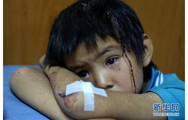 8月3日深夜,一名孩子在鲁甸县人民医院接受医治。 新华社记者胡超摄