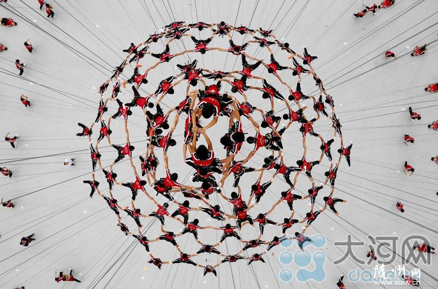 8月10日晚,第二届青奥会开幕式在南京市奥体中心举行首次正式彩排。来自河南少林塔沟武术学校988名学员,参加了开幕式3个篇章6个节目的演出,尤其是压轴节目《筑梦》,120名高空威亚在地面400名学员的配合下,上下翻飞、腾空飞跃,并组成了各种不同的造型。图为塔沟武校参加青奥会开幕式《筑梦》排练。(记者 郭俊华 通讯员 冯威锋 摄 图片来源:大河网)
