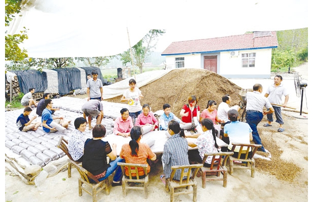 目前正值香菇装袋的关键时期,8月10日,随县三里岗镇三里岗居委会3组罗可全家装袋,10余户乡邻老少齐上阵,通过分工合作的方式当天装袋料4000袋。 (记者 李文军摄)