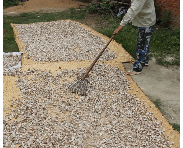 曾都何店镇向阳村共产党员孙兵,在区科协的技术指导下,带领10户村民利用2万多个松树蔸,种植茯苓喜获丰收,预计到年底总产量过10吨,收入20多万元。图为他抓住晴好天气翻晒茯苓,争取卖个好价钱。 (通讯员 多 思 江海波摄)