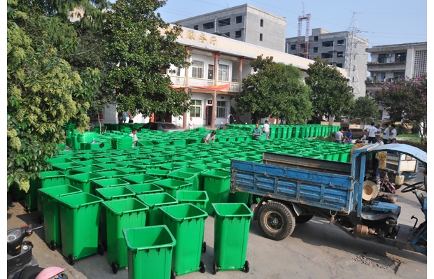 随县安居镇积极开展“洁美乡村”活动,近日新购买垃圾箱1千余只,配发到街道居民及乡村农户。(记者 陈德友 通讯员 范地明摄)