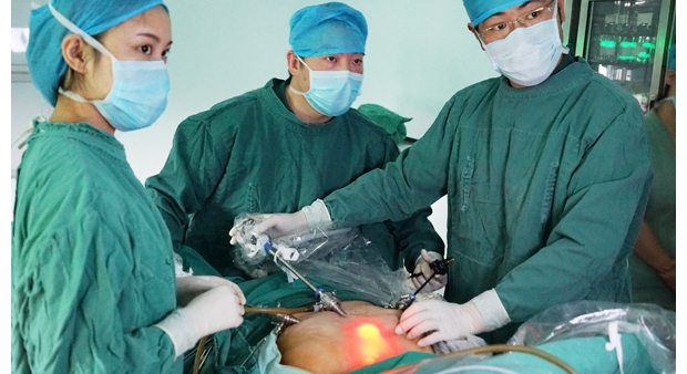 曾都医院副院长、主任医师刘峰近日为淅河镇魏畈村一女性患者向某行腹腔镜下甲状腺切除手术。这项复杂而又高难度的外科微创手术的独立完成,标志着该院外科手术微创化水平有了质的飞跃,目前处于全市同级医院领先水平。 (通讯员 邱泽宝 摄)