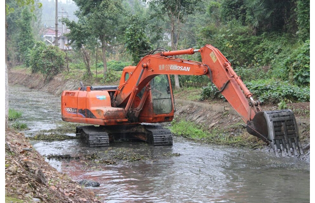为迎接千年银杏谷旅游旺季的到来,连日来,洛阳镇开展镇区及景区沿线一带环境大整治,以确保亮丽环境迎接游客。图为清运河道内杂草和垃圾。(记者 唐天才通讯员 毛利 摄)