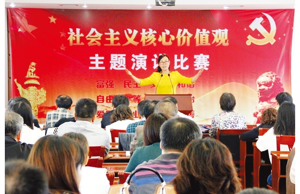 9月16日,曾都区东城办事处举办了“践行社会主义核心价值观”主题演讲比赛。15名来自不同行业的选手以身边的人和事来诠释社会主义核心价值观。(记者 李文军 通讯员 胡家勇 陈立馗摄)
