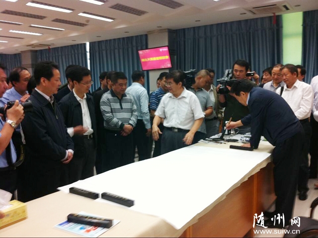 任世茂、刘晓鸣、郄英才等领导为湖北省书画家协会随州委员会成立揭牌。任世茂为天翼书画联谊活动开笔,题下“政如农功”四个大字。