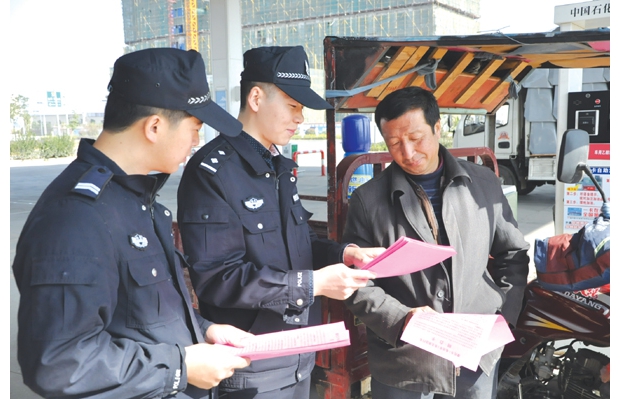 自11月1日始,随县公安局强力开展无牌摩托车“断粮”行动。图为该局工作人员在加油站利用执勤间隙向摩托车车主发放宣传单。(通讯员 叶忠江 胡木摄)