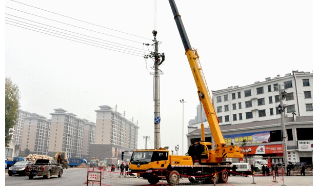 随县厉山供电所积极服务县城规划建设,加快城区电力设施改造升级。图为双休日该所组织工人、机械移栽城区幸福大道西丁字路口高压电杆,确保交通、电力平安畅通。(记者 徐斌 通讯员 张帆摄)