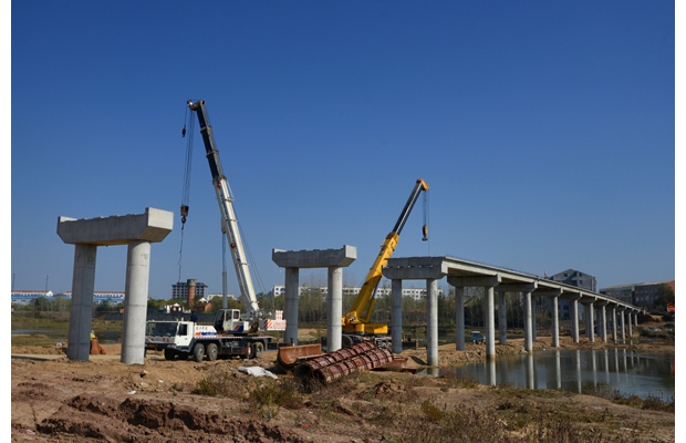 曾都区府河镇孔家畈大桥主体工程正在紧张施工。该工程由国家财政和地方配套资金550万元修建,建成后可以解决府河两岸2万人通行难题。 (记者 李文军摄)