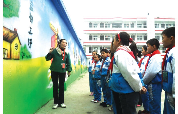 随县安居镇第二小学十分重视校园文化建设,不断开发经典诵读课程,对学生进行传统文化教育,受到社会良好赞誉。图为少先队辅导员刘萍老师在课间给学生讲述孟母三迁的故事。 (石小飞 路旭 摄)