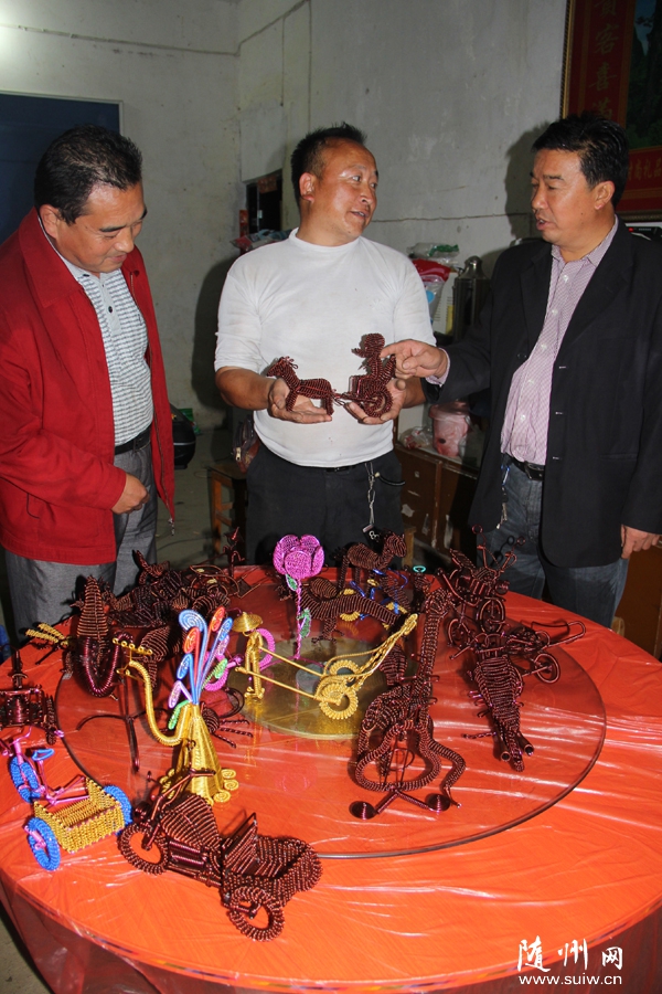 曾都区洛阳镇邱畈村艺人李召东(中),适应市场需求,利用农闲时间,用铝丝编制各种车辆、禽兽等艺术品30多种,年收入2万多元,图为他向人们介绍自己的作品。(石守京摄)