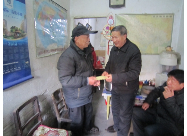 1月4日,曾都区老区建设促进会会长熊传林(中)等到西城九曲弯社区,看望基层干部,并慰问烈士后代齐家谷,送去3000元慰问金。(通讯员 黄和平摄)