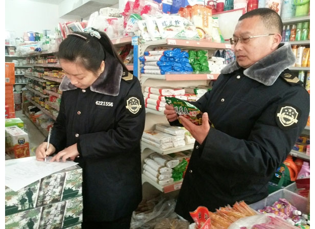 随县均川镇食药监所严把年货食品安全质量关,不间断在辖区各大超市、副食品店检查,发现问题食品,立即下架,追踪溯源,予以处罚。图为执法人员在超市检查情景。 (记者杨文明/摄 通讯员张勇/文)