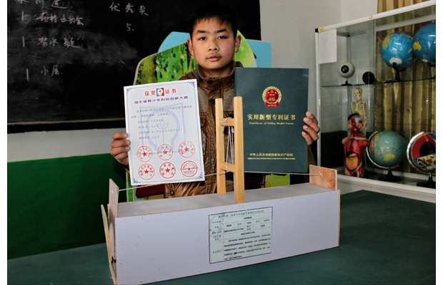 随县尚市镇净明小学六年级学生蒋春根发明的“自然捕鼠器”获得省第29届中小学生科技创新成果比赛大奖后,近日又被国家知识产权局颁发实用新型专利证书。 (记者 李文军 特约记者 江开军摄)
