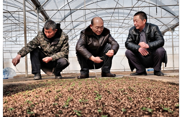 湖北谷友科技公司建成全省唯一的脱毒马铃薯种薯繁育基地,可年供应30万亩马铃薯种源。图为3月2日曾都区农业局专家正在何店谌家岭繁育基地指导大棚温控和苗管。 (记者 李文军 摄)