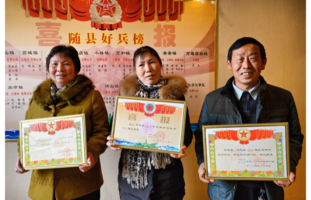3月11日,随县武装部举行仪式,向全县2014年立功受奖的60余名士兵家属送喜报。2014年随县籍官兵有2人荣立二等功,28人荣立三等功,30余人被评为优秀士兵。 (记者 李文军摄)
