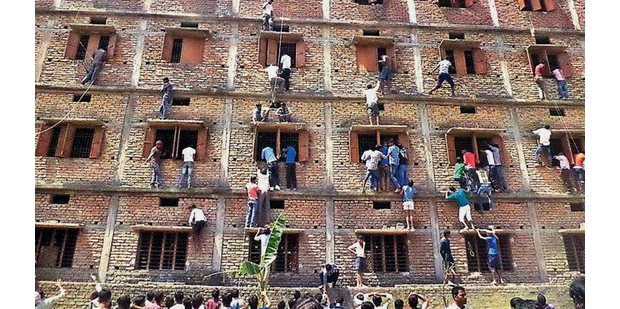 在印度电视画面中,可以看到比哈尔邦的一个四层楼考场,楼房墙外和窗下,吊挂着数十人,他们手里拿着手机和小纸条,正在与楼内参加考试的考生呼应作弊。