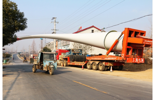 近日,寂静的随县洪山镇双河界山冲村接连运来风能设备,这个巨无霸的大家伙打破了山中的宁静。2014年5月,华能集团随县界山峰风电项目破土动工,工程总投资12亿元,分两期施工,将安装60座机组。(彭俊 李治保 摄)