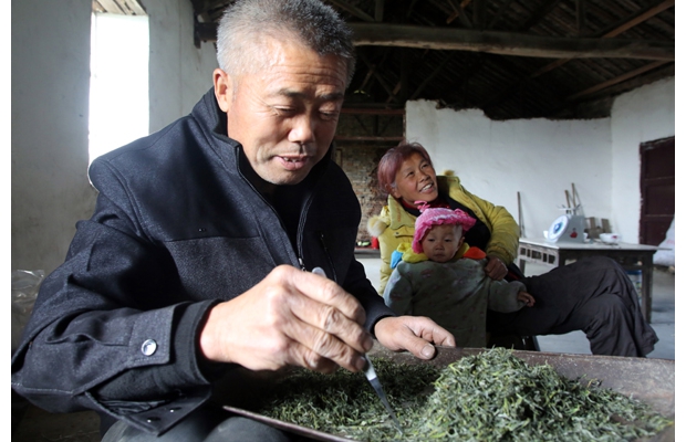 随州网讯 随州市随县二妹山茶农正在分拣刚出锅的新鲜茶叶。茶农们介绍,为保持春茶好的口感,他们坚持手工炒茶,受到客户的青睐。 (记者 孙洪涛 摄)