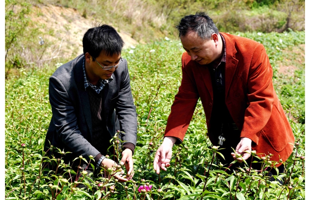 随州网讯 近年来,随县草店镇利用旅游景点大力发展观光农业,仅在位于佛祖洞景点的檀山村,就引种了1500亩牡丹、芍药、金银花,每年春季花开引来四方游客。图为县扶贫办人员在药材园区了解生长情况。(本报记者 金鸣 通讯员 铁流 仁俊摄)