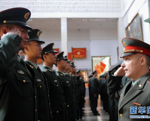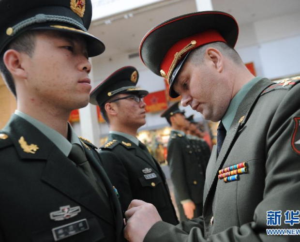 5月6日,在俄罗斯首都莫斯科,中国人民解放军三军仪仗队士兵接受俄罗斯国防部代表授勋。俄罗斯国防部6日在莫斯科授予参加红场阅兵的中国仪仗兵纪念勋章。112名中国人民解放军三军仪仗队官兵将于9日参加纪念卫国战争胜利70周年红场阅兵。新华社记者贾宇辰摄