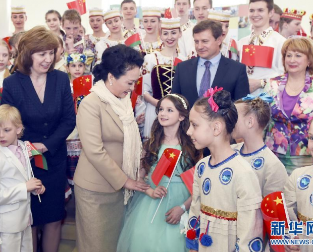 5月11日,习近平主席夫人彭丽媛在明斯克参观白俄罗斯国家儿童和青少年艺术创作中心。这是彭丽媛同孩子们亲切交流。 新华社记者 李学仁 摄