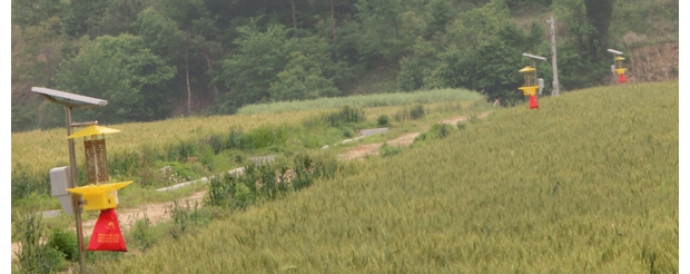 随州网讯 近日,随州市曾都农业部门为加强农作物病虫害防控,投资购买一批全自动频振式太阳能杀虫灯,在何店镇王店村农田安装。该灯可利用太阳能供给能量,晚上自动开灯,白天自动关灯,能诱杀目前主要农作物害虫。(记者 唐天才 通讯员 陈仙仙 摄)