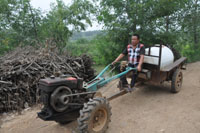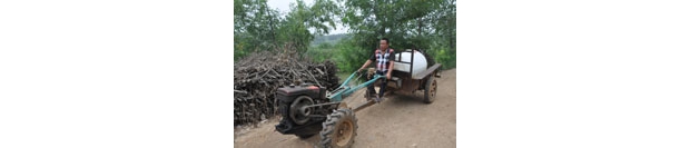 54岁的余庭洋开着手扶拖拉机,来到村头的机井旁。他拿起抽水管,把抽出的井水注进拖拉机上的大塑料桶里。不到10分钟,塑料桶已经注满,余庭洋发动拖拉机,开始挨家挨户送水。