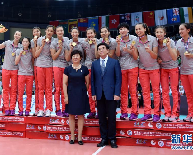 5月28日,中国队与颁奖嘉宾合影。当日,在天津体育馆进行的2015年亚洲女子排球锦标赛决赛中,中国队以3比0战胜韩国队,夺得冠军。 新华社记者张晨霖摄