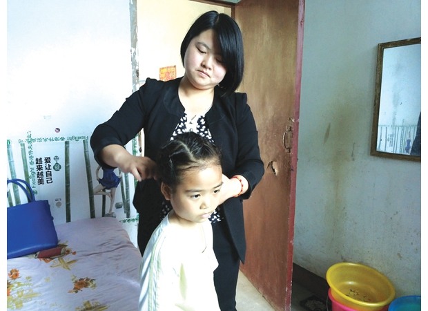 随州网讯 随州市随县洪山镇郭集小学老师与社会爱心人士一起,开展“爱心妈妈”关爱留守儿童活动。图为“爱心妈妈”李春艳为留守儿童梳头。(记者 杨文明 通讯员 郭远成 摄)