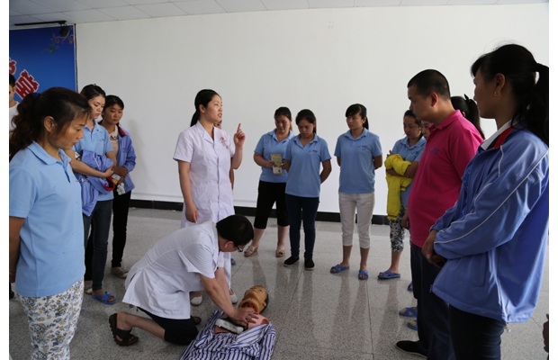 随州网讯 7月1日,随州市广水卫计局组织广水市一医院等医疗单位医务人员,到该市新诚达服饰有限公司为企业员工讲授急救知识和急救方法,发放急救药品、避孕药具和健康资料,以此庆祝党的94岁生日。(通讯员 刘晓斌 何亚凌摄)