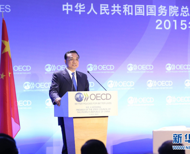 当地时间7月1日上午,国务院总理李克强应邀在位于巴黎的经济合作与发展组织总部发表主旨演讲。 新华社记者丁林摄