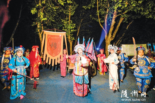 随州网讯   7月18日晚,由随州市老年大学和市曲艺家协会共同排练的纪念抗战70周年曲艺节目《穆桂英挂帅》在市神农公园义务演出,让广大戏迷们大饱眼福。 (记者 李文军摄)