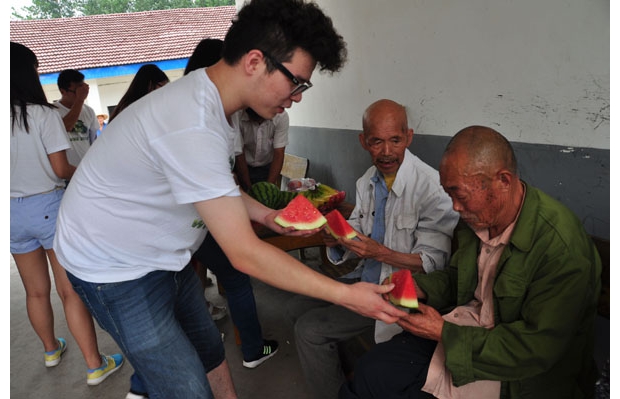 随州网讯 武汉大学经济与管理系二年级八名党员学生,日前来到随州市随县厉山镇神农、王家岗、灯塔等村到田间锄草、摘瓜果,并购买水果,自编文艺小节目慰问镇福利院的孤寡老人。(记者 孙洪涛 通讯员 龚承斌 李国富摄)