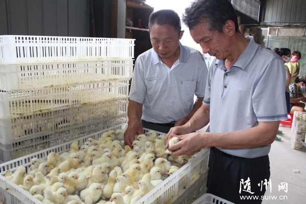 随州网讯   省农科院家禽育种专家申杰副研究员常驻随州,潜心改良随州地方品种“洪山鸡”。图为申杰(右)在孵化车间指导挑选鸡苗。 (记者 徐斌 通讯员 许贤超 摄)