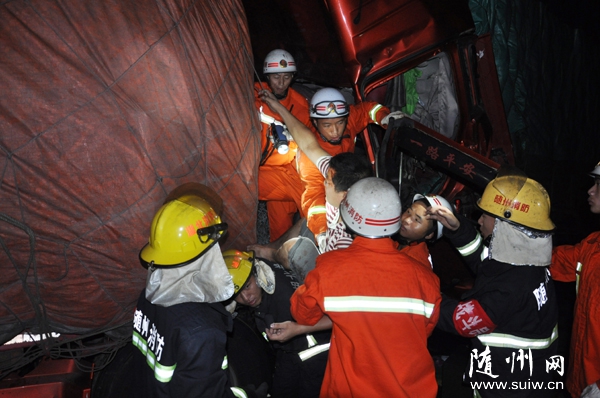 随州网讯    7月20日凌晨2点,随岳高速往河南方向的鄂豫收费站旁发生一起交通事故,随州市曾都区消防中队接警后,将2名被困者安全救出。(记者 黄闯 通讯员 杨金溧摄)