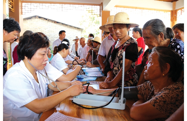随州网讯 7月31日,医务人员在随州市广水武胜关镇桃源村免费为农民做健康检查,并发放药品。连日来,广水市开展“千名医生入万户家庭惠十万群众”大型医疗服务活动,1000余名医务人员深入农村开展卫生计生政策和健康知识宣传、免费义诊,活动将持续5个月。 (通讯员 刘晓斌 何亚凌摄)