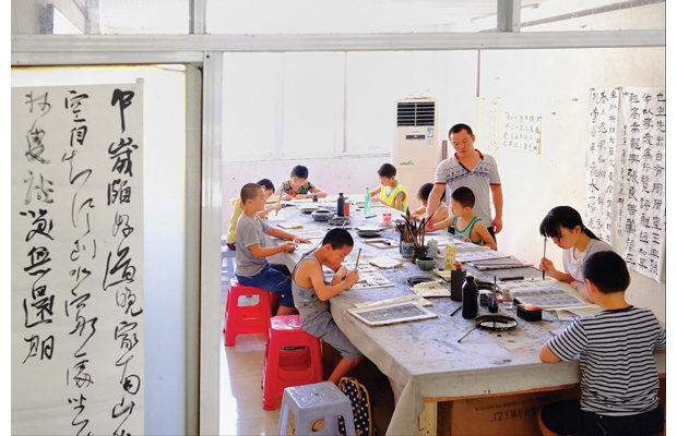 随州网讯 随州市曾都区西城办事处双龙寺社区免费为居民提供“书情画意”活动场地和笔墨文具,打造“文化社区”。图为该社区暑假免费为孩子们提供书法培训。(记者 李文军摄)